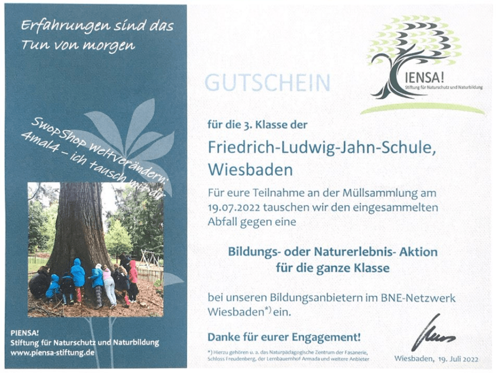 Wie geplant ist unser "SwopShop Weltverändern" noch vor den Sommerferien an einer Pilotschule gestartet. Wir sagen Danke an die Friedrich-Ludwig-Jahn-Schule und alle, die uns bei dieser Aktion unterstützt haben. Mit der auf die 3. und 4. Klasse ausgerichteten Aktion konnten wir insgesamt rund 65 Schülerinnen und Schüler erreichen. Die Natur-Events bei unseren BNE-Netzwerkpartnern finden nach den Sommerferien statt.