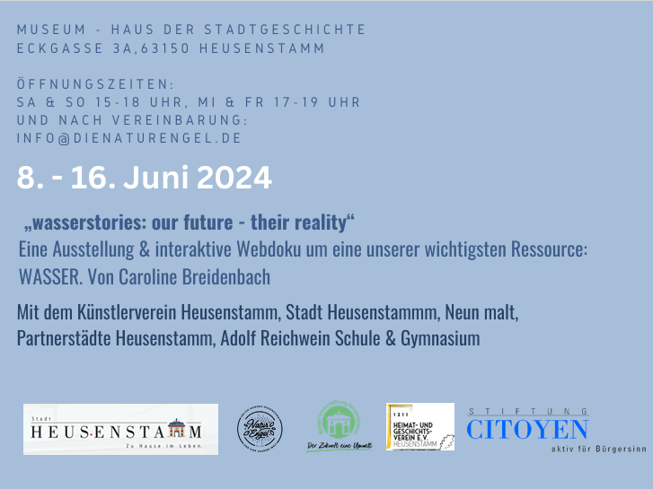 The joint project of the association Die Naturengel e. V. with the local history and heritage association,the city of Heusenstamm and the Heusenstamm Citizens' Foundation also includes schools, the twin towns and other initiatives and associations. This creates an exhibition with vdifferent perspectives on what is probably the most important resource: WATER.